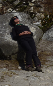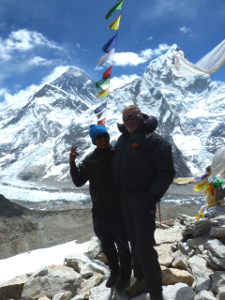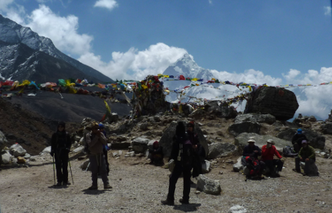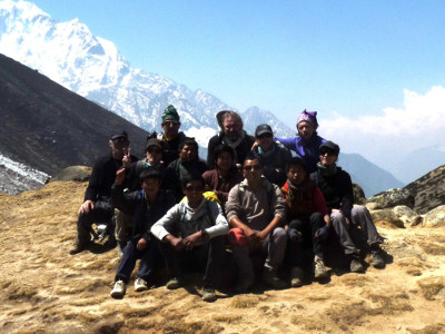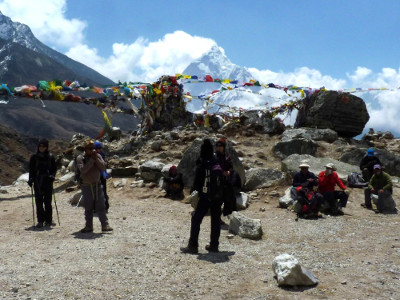 La nuit a été courte et quelque peu agitée pour la plus part d'entre nous ; il faut bien le dire, dormir à cette altitude n'est pas quelque chose d'habituel et malgré une bonne acclimatation, nos corps réagissent. Pour ma part, cela fait trois jours que je mange peu et je commence à le payer. Mais bon, le vieux est coriace et hyper motivé, ça va le faire !!! Bon allez, on y va. L'ascension à la lueur de nos frontales est lente, nous traversons une moraine qui nous donne un aperçu sur le glacier de l'Everest, tout cela sous le lever du soleil, le paysage est grandiose, l'émotion me submerge, j'y vais de ma petite larme. Nous sortons de la moraine pour rejoindre le village de Gorak Shep, dernier village de lodge dans la vallée. Depuis le début de la journée, Suzanne ne va pas très bien et alors que nous prenons le thé, celle-ci est atteinte du mal aigu des montagnes, il faut agir et vite. Nous la mettons sous oxygène et elle reprend ses esprits. Agnès, jeune médecin polonaise, prend en charge notre amie Suzanne et lui injecte un décontractant qui l'aidera à supporter la douleur dans l'attente d'un rapatriement sanitaire par hélicoptère. C'est la fin de l'aventure pour Suzanne mais nous sommes rassurés car elle va de mieux en mieux. Milan décide de rester avec Suzanne et confie le groupe à Irzun. Ghislaine, après quelques hésitations, décide elle aussi de poursuivre l'aventure. Nous repartons donc vers Kala Patthar, il nous reste 300 mètres à gravir : ils seront durs, avec un petit malaise pour ma part (un gros coup de fringale je pense) ; Ghislaine a eu peur, Irzun me prend en main et nous arrivons tous les uns après les autres au sommet sans encombre. L'Everest est là devant nous, majestueux. Oui, nous l'avons fait et nous pouvons en être fiers. Une petite pensée pour Suzanne qui l'aurait bien mérité ce pic... Le froid nous saisit, nous faisons quelques photos et redescendons sur Gora Shep. Suzanne a été évacuée, elle se repose à Katmandou à l’hôpital. Milan décide de descendre à Pheriche car cela n'est guère plus loin et le lodge est plus confortable et l'altitude plus faible, cela nous permettra de mieux récupérer et de nous remettre de nos émotions. Petite marche dans le silence, tout le monde semble comblé et heureux, de bien beaux visages remplis de satisfaction et de joie. Nous étions venus pour cela, nous avons réussi notre aventure, il faut désormais penser à rentrer et nous avons encore de belles journées devant nous. Demain une grande journée de marche jusqu’à Pangboche nous attend, il faut récupérer.