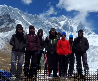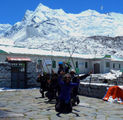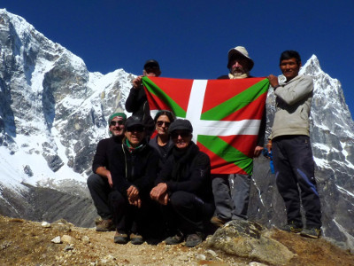 Cependant, cela ne nous empêchera pas de faire une superbe ballade dans la neige en direction de Chukung pour atteindre 5000 m. Nous sommes en forme et tout le monde tient le rythme. Nous décidons de faire le paquito à 4730 m durant le tea time. Nous repartons vers un sommet inconnu afin d'atteindre les 5000 m. Les Basques auront enchaîné leurs records d'altitude durant tout le séjour (3000, 4000, 5000 m) : respect !! Mon premier 5000 m : je suis ému d'autant plus que le panorama est extraordinaire avec plein de pics mythiques autour de nous ... Il faut redescendre pour une petite pause déjeuner. Un jeune guide diffuse de la musique dans le lodge durant le repas, les filles ne peuvent se retenir et improvisent une danse à 4730 m : bravo Mesdames ! Nous redescendons sur Dingboche pour un petit repos car demain grosse journée de marche vers Lobuche.