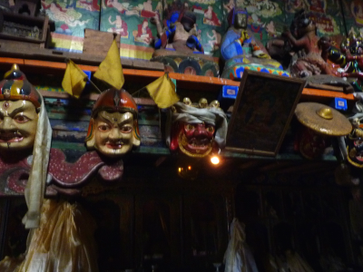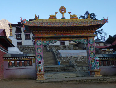 Afin de parfaire notre acclimatation, une petite ballade de 4 heures nous conduits à Pangboche. L'altitude commence à se faire sentir, Ghislaine confond les "bobos" et les "bonobos" et "cru/cuit", Sylvie a mal à la tête, Francis ne fait plus pipi, Jean-François ne fume plus qu'une clope par jour et j'ai un peu mal au bide. A part cela, tout va bien. La visite du monastère de Pangboche est très instructive et les couleurs sur le chemin du retour sont splendides, un magnifique coucher de soleil sur les montagnes. De retour au lodge, petite veillée autour du poêle et un gros dodo car la journée du lendemain - bien que courte - est assez difficile car nous allons atteindre l'altitude de 4000 m.