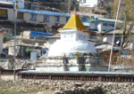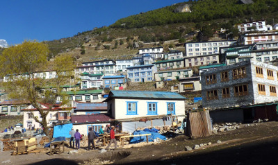 Une très belle journée de marche nous conduits jusqu’à Manche-Bazar, un très gros village considéré comme la capitale du pays "Sherpa". Les dzos (mélange de yack et de vache) et les mules nous accompagnent, soulevant des nuages de poussière mais les foulards basques font bien leur effet et facilitent notre progression. Nous rentrons dans le parc national du Népal où les guides valident nos permis de trekking, nous sommes en règle et pouvons donc poursuivre notre chemin. Nous sommes dans un très joli lodge et tous très ravis de boire le thé et la bière, réunis autour du poêle alimenté à la bouse de yack. Le repas nous révélera une surprise avec la découverte des "Momo", très bons raviolis à la viande de yack ou aux légumes. Jean-François n'a pu s’empêcher de jouer les espions, espérons qu'un jour il nous en confectionnera.