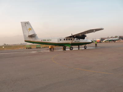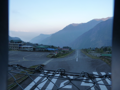 Nous sommes sur le premier vol du matin vers Lukla qui a lieu à 7 heures. Nous nous levons à 5 heures et prenons la direction de l'aéroport pour ce magnifique trajet d'altitude qui nous fait atterrir à 2800m après environ 40 minutes de vol. L'hôtesse est charmante et les pilotes au top ... L'atterrissage est maîtrisé malgré une piste très réduite ... Tout le monde va bien, le trek peux commencer.
