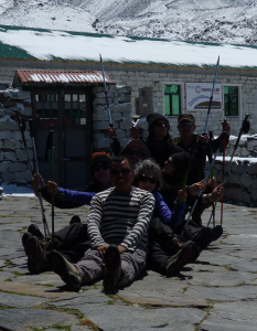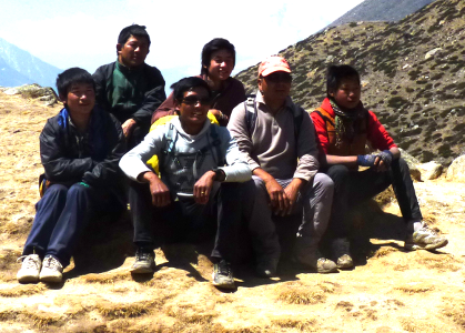 Nous croisons de nombreux retours d'expédition de l'Everest qui ont été annulées suite à l'avalanche survenue la veille de notre arrivée. Les charges portées par les "Sherpa" nous impressionnent et imposent le respect. Nous croisons les nôtres à mi-parcours, une super photo avec tout le monde un peu avant l'arrivée à Bingboche nous donne un regain de forme qui nous permet d'arriver au village sans encombre.
