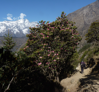 "Pourtant que la montagne est belle" chantait Jean Ferrat , ici, elle n'est pas belle, elle est féerique. Imaginez la Provence avec des rhododendrons partout, une rivière couleur turquoise, quelques pics enneigés, le tout réuni en un seul et unique endroit : le paradis quoi ! Et bien cet endroit existe entre Pengboche et Manche. La marche fut très aisée tant le paysage fut exaltant. Pas grand-chose à dire hormis "contempler, contempler".